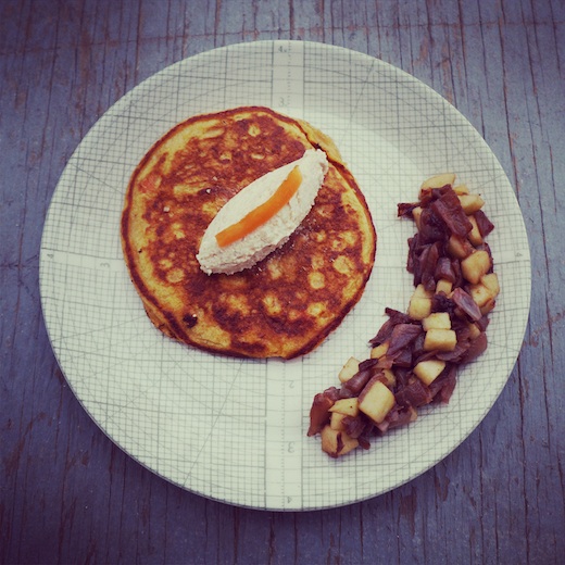 3. dresser le pancake tout chaud dans une assiette, déposer dessus une noisette (ou une noix, ou une boule) de crème montée au bacon, disposer la compotée sur le côté